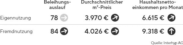 Abgebildet sind Durchschnittswerte auf Basis der Finanzierungskennzahlen der Interhyp Gruppe. Pfeile zeigen die Trendentwicklung im Vergleich zum Vormonat an.