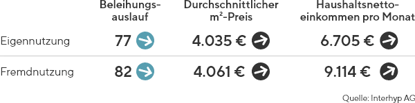Abgebildet sind Durchschnittswerte auf Basis der Finanzierungskennzahlen der Interhyp Gruppe. Pfeile zeigen die Trendentwicklung im Vergleich zum Vormonat an.